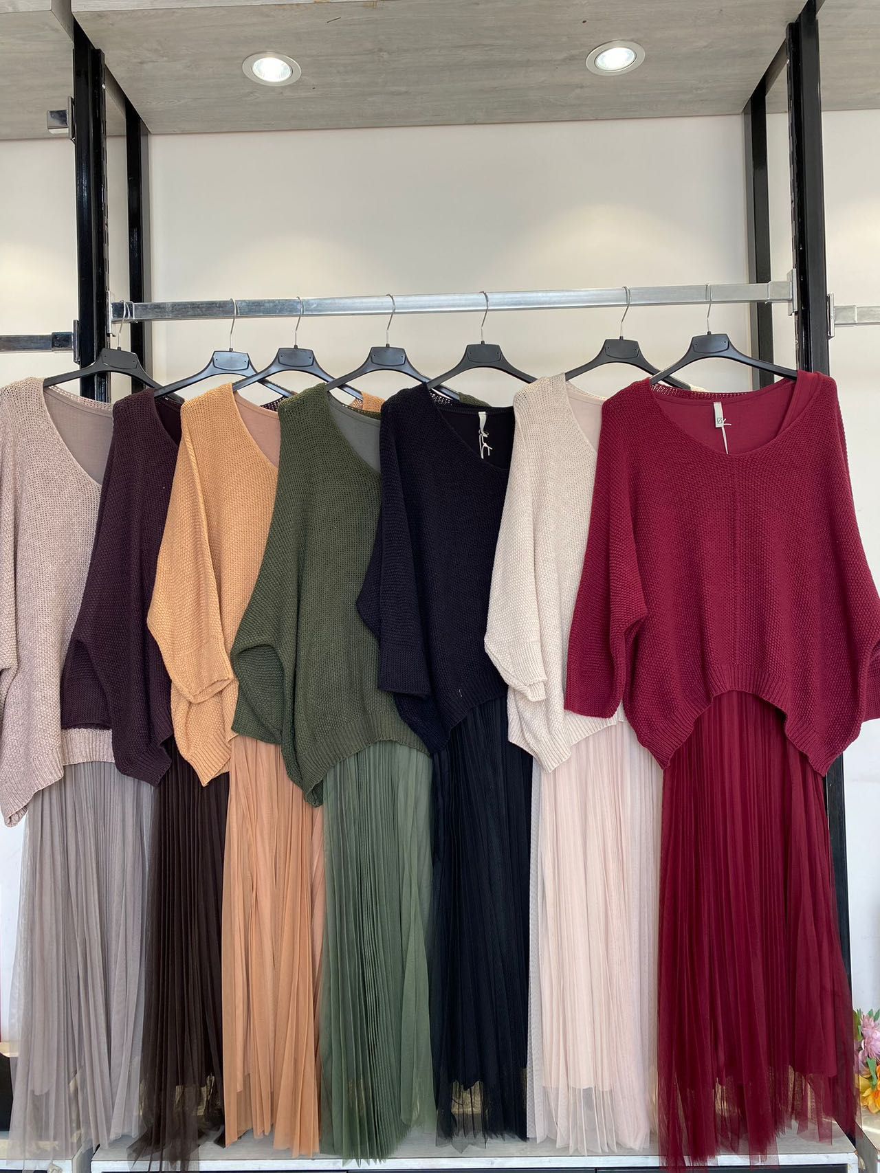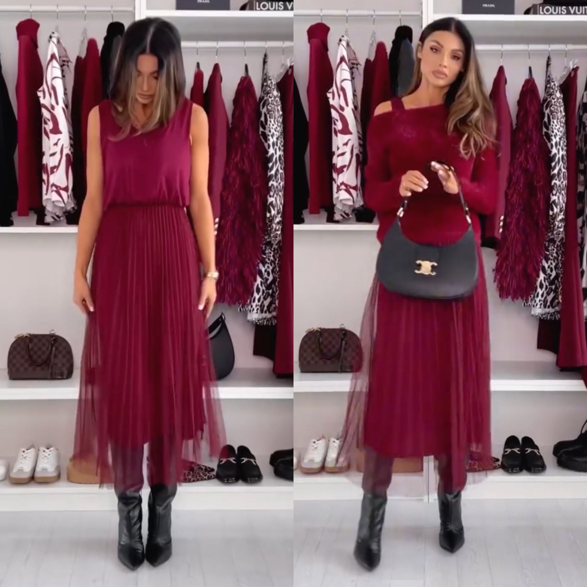 Tato dvoudílná sada Alessia spojuje jemné šaty s tylovou sukní a sladěný svetr do jednoho promyšleného outfitu. Ideální volba pro chladnější dny i společenské události, kdy chcete vypadat upraveně bez zbytečného hledání kombinací.