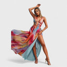 Šaty Maelys přinášejí jemný akvarelový vzhled a vzdušnou siluetu, která se ladně pohybuje při každém kroku. Tento dlouhý model byl navržen pro večerní události, dovolené u moře nebo letní setkání pod hvězdami.