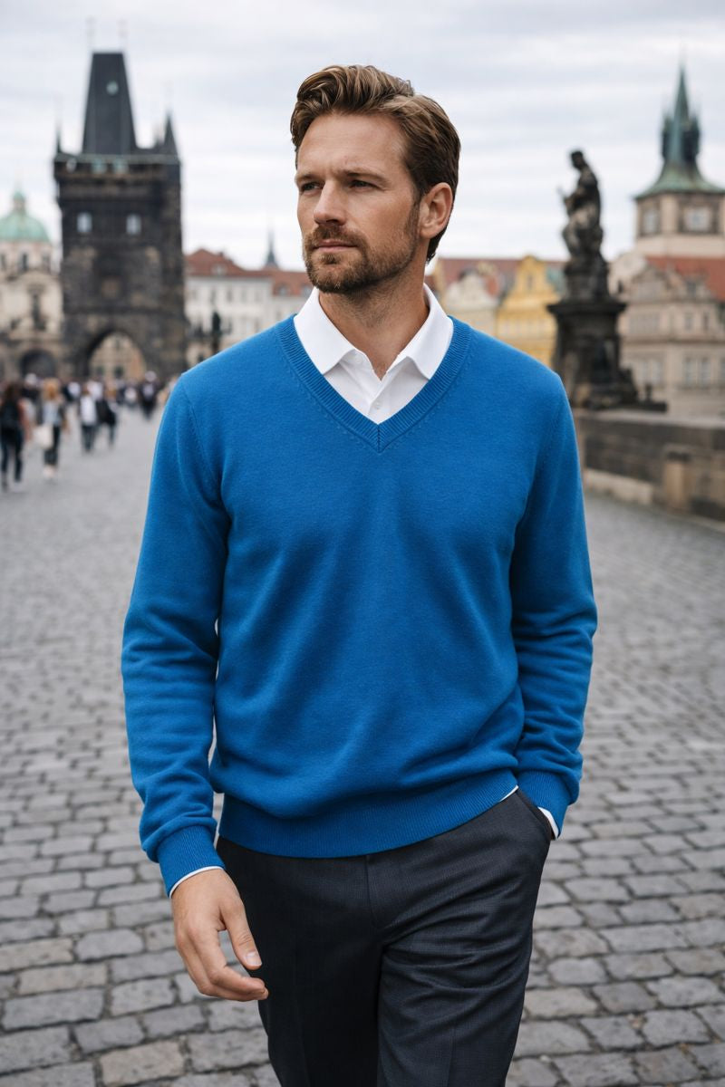 Adam pulovr s výstřihem do V ztělesňuje rafinované pohodlí pro muže, který si cení nenápadné elegance. Nabízí měkké, lehké teplo, které se cítí přirozeně a vypadá bez námahy distingovaně. Od chladných ranních hodin po uvolněné večery. Je to kousek, po kterém sáhnete instinktivně, sezónu za sezónou.