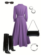 Tyto šaty mají lichotivý výstřih do V a dlouhé rukávy s manžetami pro vyvážený a rafinovaný vzhled. Přiléhavý pas je zvýrazněn odpovídajícím páskem a zlatou sponou, zatímco sukně s plnými sklady dodává krásný pohyb a eleganci. Perfektní volba pro elegantní styl a každodenní pohodlí.