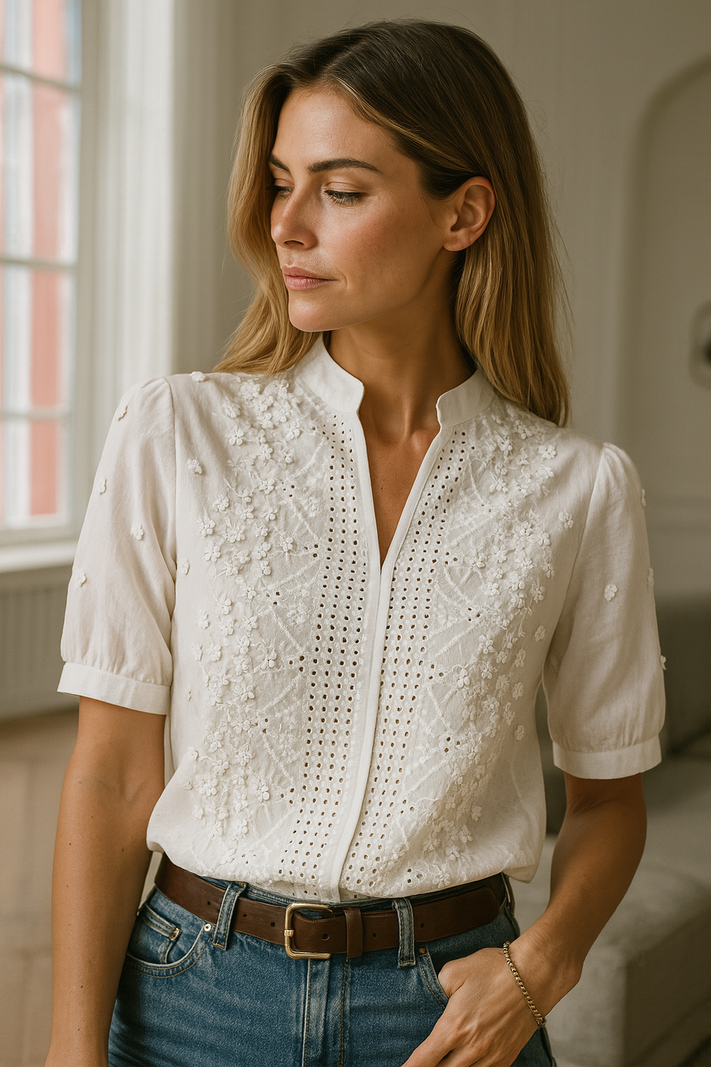 Tento top kombinuje rovný siluetu s bohatými květinovými detaily na předním díle. Stojáček a hluboký v-výstřih společně vytvářejí svěží a ženský vzhled. Subtilní balónové rukávy dodávají designu lehkou strukturu. Kontrast mezi hladkým materiálem a otevřeným vyšíváním okamžitě přitahuje pozornost.
