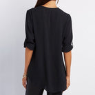 Tento top má uvolněný siluetu s hlubokým v-výstřihem a polo zipem. Ohrnuté rukávy s detailem pásky dodávají designu neformální nádech. Zaoblený lem plynule přechází přes boky a vizuálně prodlužuje postavu. Univerzální základ s moderním nádechem.