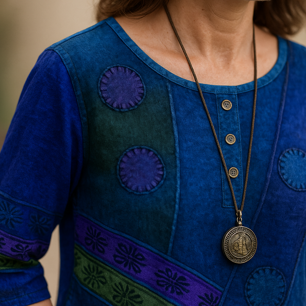 - Kulatý výstřih s knoflíky: dodává charakter designu