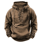Dominantním prvkem je tradiční vikingské šněrování, které nejen podtrhuje autentický vzhled, ale zároveň umožňuje individuální nastavení výstřihu podle potřeby a vrstvení oblečení. Tento funkční detail dodává mikině osobitost a praktičnost.